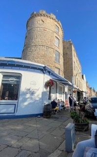 With rooms not yet ready, we stored our bags and set off to explore. The streets of Leith felt alive with possibility: boats bobbed along the canal, and every shopfront seemed to overflow with a riot of summer flowers in boxes and baskets. Two blocks on, the Clock Cafe drew us in with the sweet promise of pastries and fresh bread. The display case was a parade of temptation. I chose Eggs Benny—rich, creamy, and bright—while Magan ordered a traditional Scottish breakfast of eggs and fresh fruit. The locals greeted us with warmth and laughter, delighting in our Southern American accents and easy smiles. We felt welcomed, almost as though we were old friends returning after a long absence.