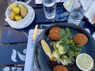 Wonderful meal of fresh fish cakes and, of course, potatoes at Fisher’s